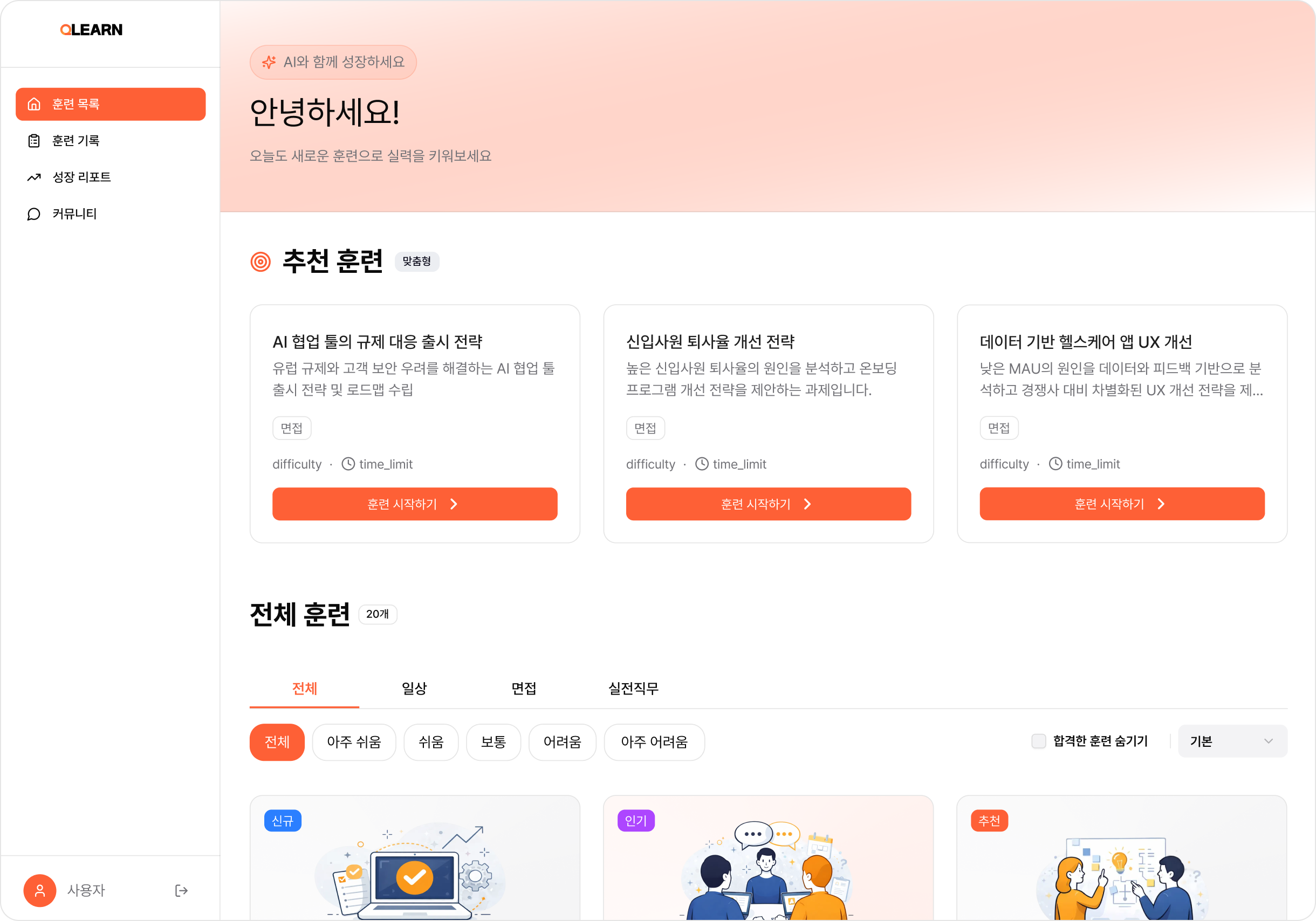 실제 과제를 기반으로 AI와 끊임없이 상호작용하며 맥락을 파악하고 대화를 주도하는 능력을 기르는 실전형 훈련 서비스입니다. 사용자의 발화 의도를 AI가 분석하여 피드백을 제공하며, 문제 해결력과 AI 리터러시를 극대화합니다. 기업 임직원, 실무자, 그리고 AI를 도구가 아닌 파트너로 활용하여 성과를 높이고 싶은 누구에게나 능동적인 성장 경험을 제공합니다.